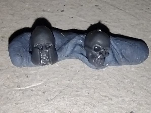 For the remaining kit bashes I decided that I would use skeleton heads that already had helmets and make them look more like those of the hoplites. So I used some blue stuff to make a moulds of the sides of the hoplite helmets. Then adding green stuff in the mould and cutting it when set to add to the skeleton helmets. This together with a little re-modelling of the helmet with a scalpel looked better than the previous method.
