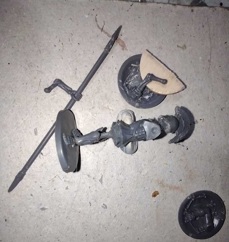 The skeletons come with a spear carrying arm and a shield carrying arm but as can be seen on the left shield the hoplite shields needed the arms removed.