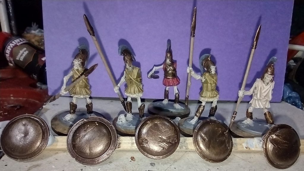 Not shown in the photo above, I did a very basic shield design inspired by the eye on the front of the Argo in the Jason and the Argonauts film and I remember seeing them on Maltese fishing boats, and they are probably used all over the Mediterranean. I am not very confident with freehand stuff but this design was fairly simple and used one colour, Army Painter Warpaints Stone Golem. Then I added some chipping with a sponged on mix of Weapon Bronze and Rough Iron.